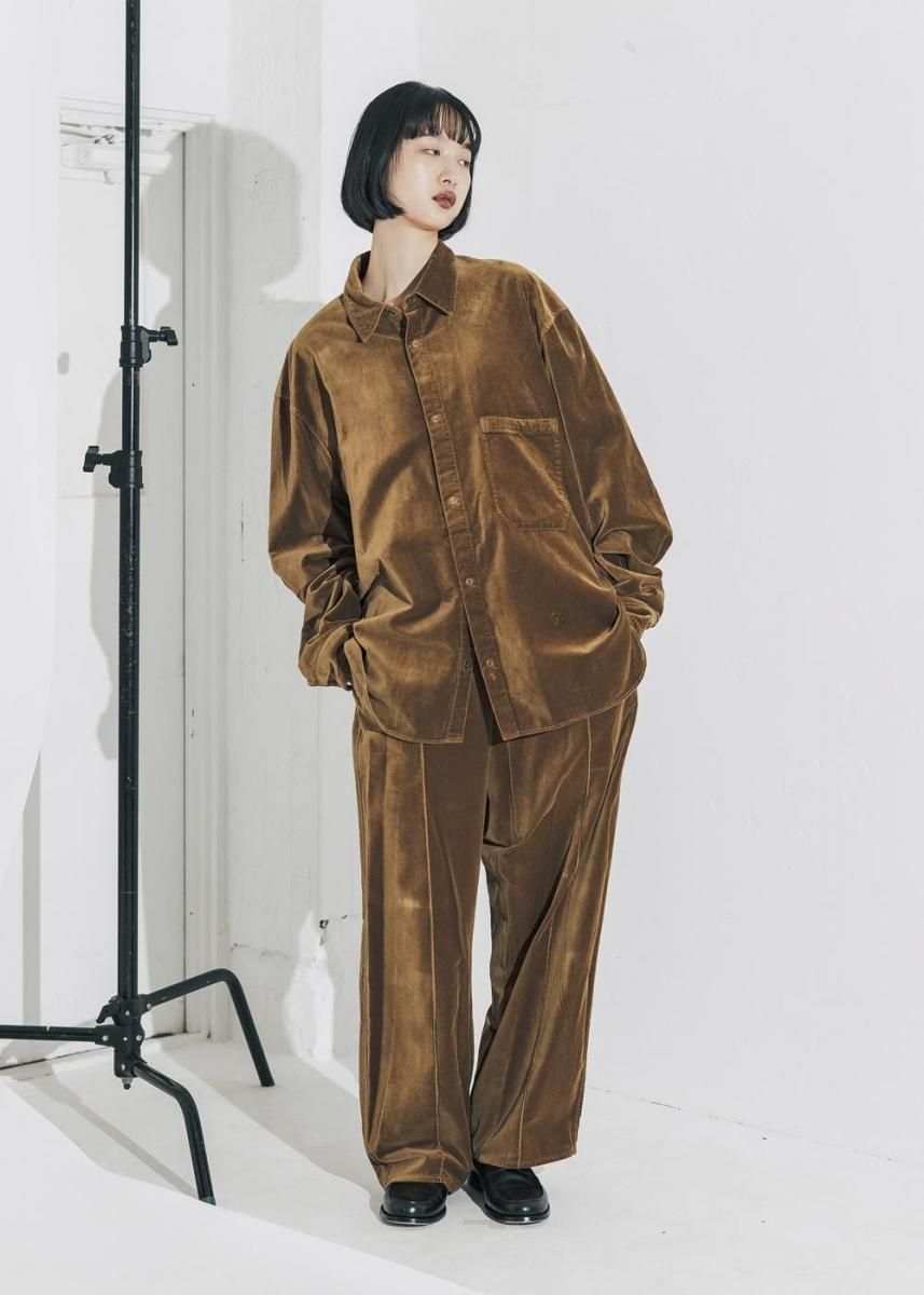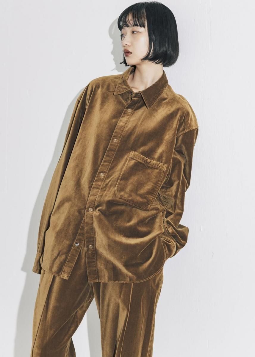 美しい起毛と光沢感のあるコットンベルベットは上質糸のみを厳選し、ていねいに仕上げることで作られる特殊素材です。 他にはない滑らかな光沢と軽さ、柔らかさを感じられる風合いに仕上がっています。 この上質な素材をあえて製品染めしたあとにバイオウォッシュ加工を施すことで独特な表情に仕上げています。 程よく身体から離れるシルエットのオーバーシャツ。着脱のしやすさを考えたスナップボタンやヨークではなく肩パッドのように表地を二枚重ねた肩回りなど、 オーセンティックなシャツとしてだけでなくカバーオールのように羽織って着ることも想定した機能性を兼ねた意匠性がデザインポイント。