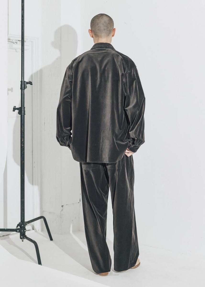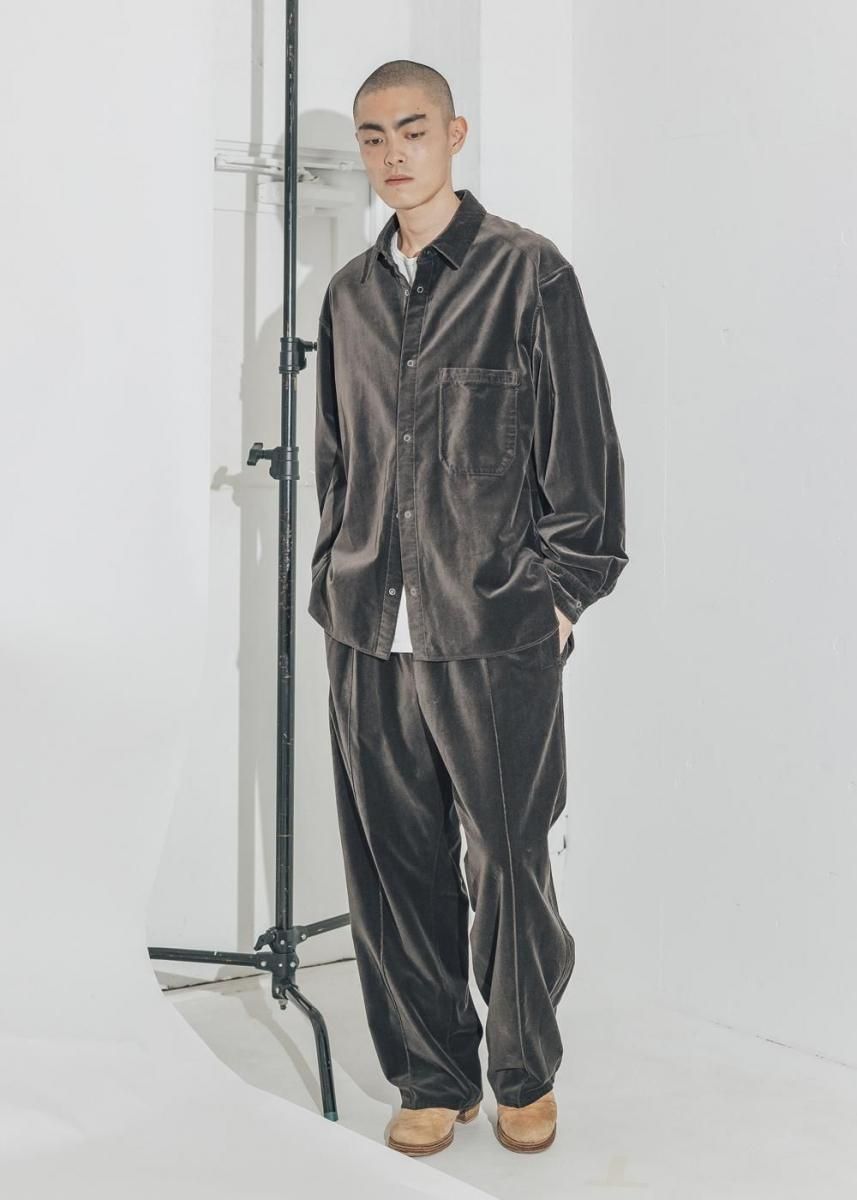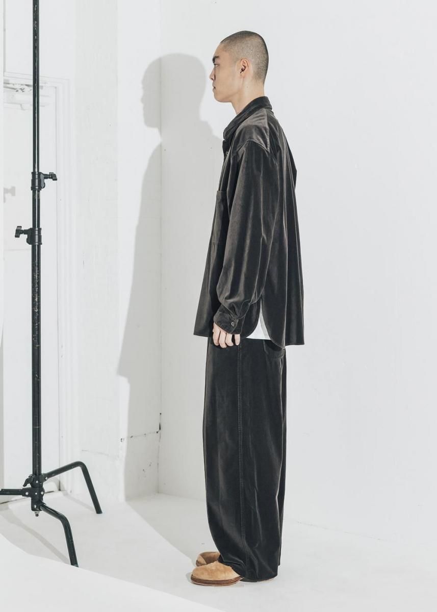 美しい起毛と光沢感のあるコットンベルベットは上質糸のみを厳選し、ていねいに仕上げることで作られる特殊素材です。 他にはない滑らかな光沢と軽さ、柔らかさを感じられる風合いに仕上がっています。 この上質な素材をあえて製品染めしたあとにバイオウォッシュ加工を施すことで独特な表情に仕上げています。 程よく身体から離れるシルエットのオーバーシャツ。着脱のしやすさを考えたスナップボタンやヨークではなく肩パッドのように表地を二枚重ねた肩回りなど、オーセンティックなシャツとしてだけでなくカバーオールのように羽織って着ることも想定した機能性を兼ねた意匠性がデザインポイント。
