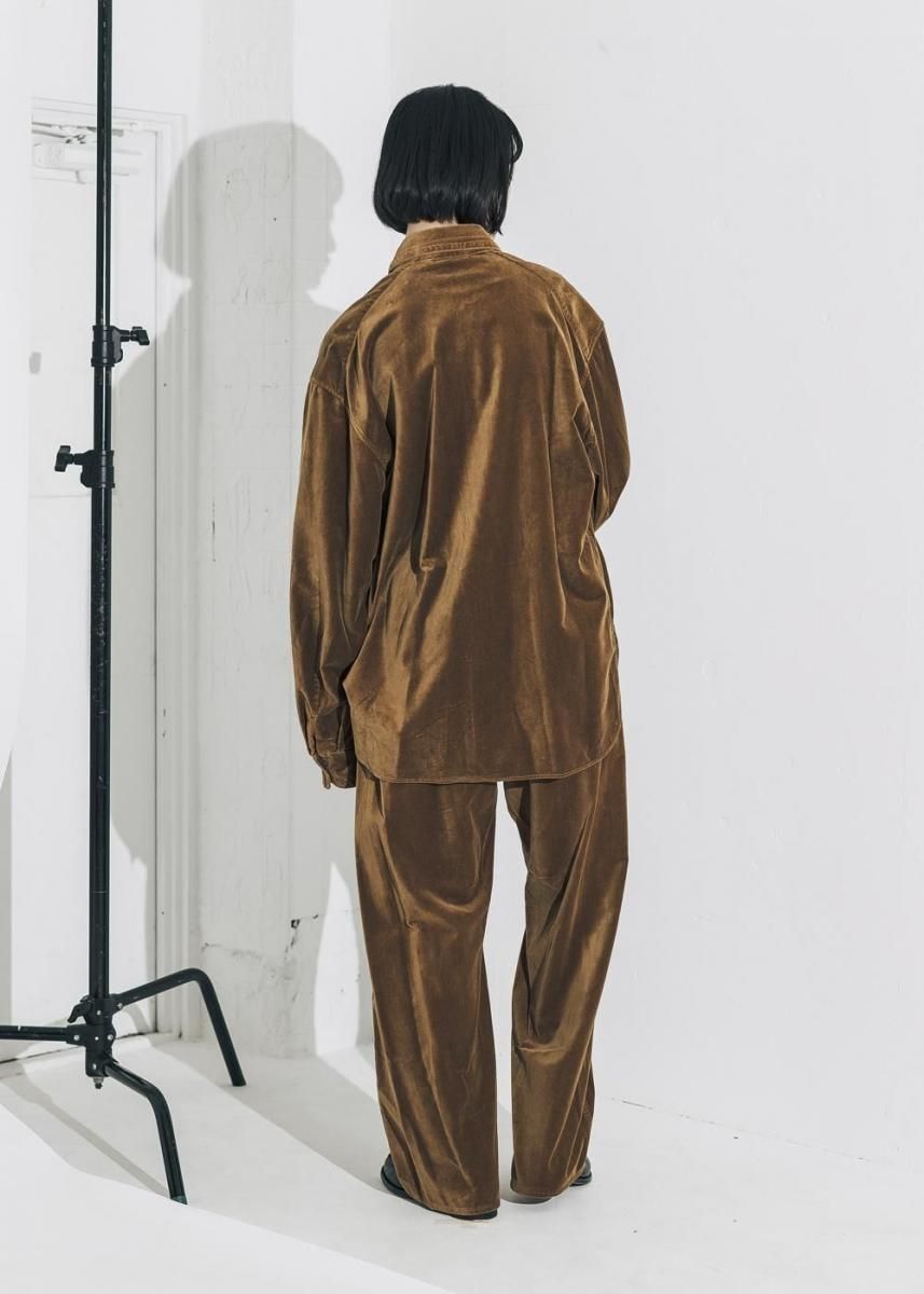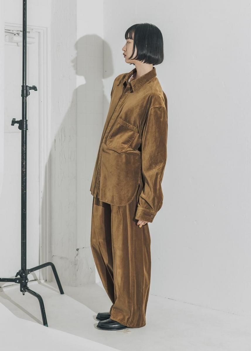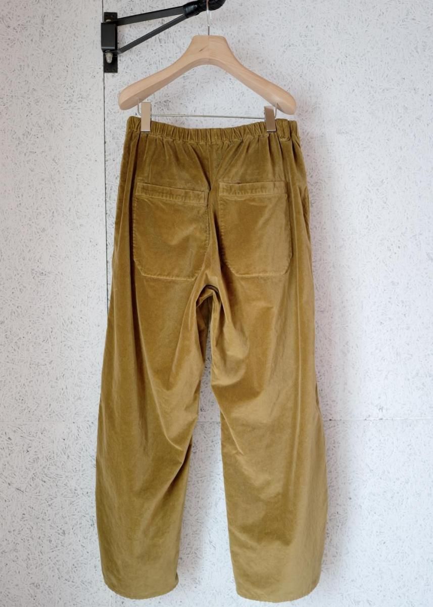 美しい起毛と光沢感のあるコットンベルベットは上質糸のみを厳選し、丁寧に仕上げることで作られる特殊素材です。 他にはない滑らかな光沢と軽さ、柔らかさを感じられる風合いに仕上がっています。 この上質な素材をあえて製品染めしたあとにバイオウォッシュ加工を施すことで独特な表情に仕上げています。 脇に丸みを持たせたワイドシルエットが特徴のイージーパンツ。丸みがありながらシャープなフォルムを目指しています。 クリース線上に配したピンタックやポケットなど、シンプルなアイテムの中にも細やかな意匠性を持たせています。 ベルト裏のスピンドルでぎゅっと絞ることができるので、大きめのサイズを選んでオーバーサイズに着用するのもおすすめです。