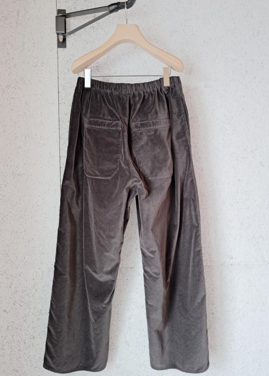 美しい起毛と光沢感のあるコットンベルベットは上質糸のみを厳選し、丁寧に仕上げることで作られる特殊素材です。 他にはない滑らかな光沢と軽さ、柔らかさを感じられる風合いに仕上がっています。 この上質な素材をあえて製品染めしたあとにバイオウォッシュ加工を施すことで独特な表情に仕上げています。 脇に丸みを持たせたワイドシルエットが特徴のイージーパンツ。丸みがありながらシャープなフォルムを目指しています。 クリース線上に配したピンタックやポケットなど、シンプルなアイテムの中にも細やかな意匠性を持たせています。 ベルト裏のスピンドルでぎゅっと絞ることができるので、大きめのサイズを選んでオーバーサイズに着用するのもおすすめです。
