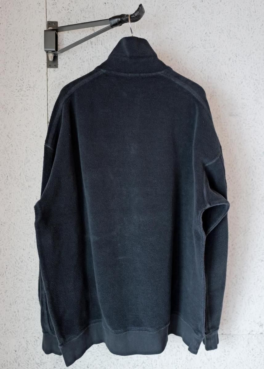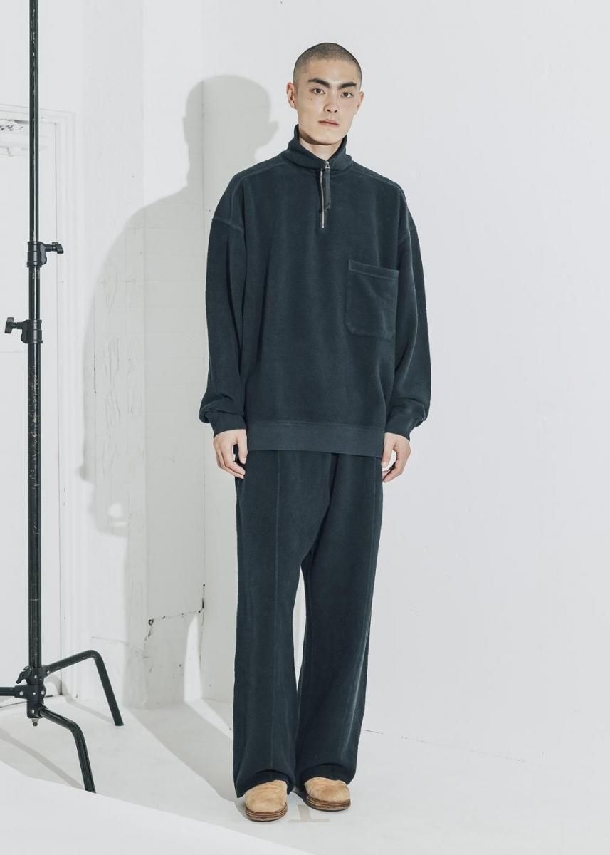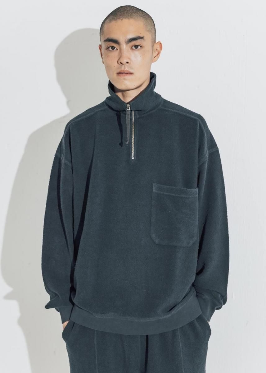 ハーフジップのプルオーバー。ルーズシルエットに仕上げています。 上質な綿糸が持つしなやかさと柔らかな風合いが特徴の裏毛を使用しています。 裏毛面を特殊な起毛機で細かく起毛させてそちらを表面として使用し、製品硫化染めしたあとにバイオウォッシュ加工をすることで独特なフェード感を表現しています。 肌にあたる裏面には起毛面より細番手のコットンを使用しているので、肌当たりはより柔らかく繊細なタッチになることも計算しています。 ※デッドストックの裏毛素材を使用してさらに特殊加工しているので、一点一点サイズ感が微妙に異なります。商品の特性としてご了承ください。