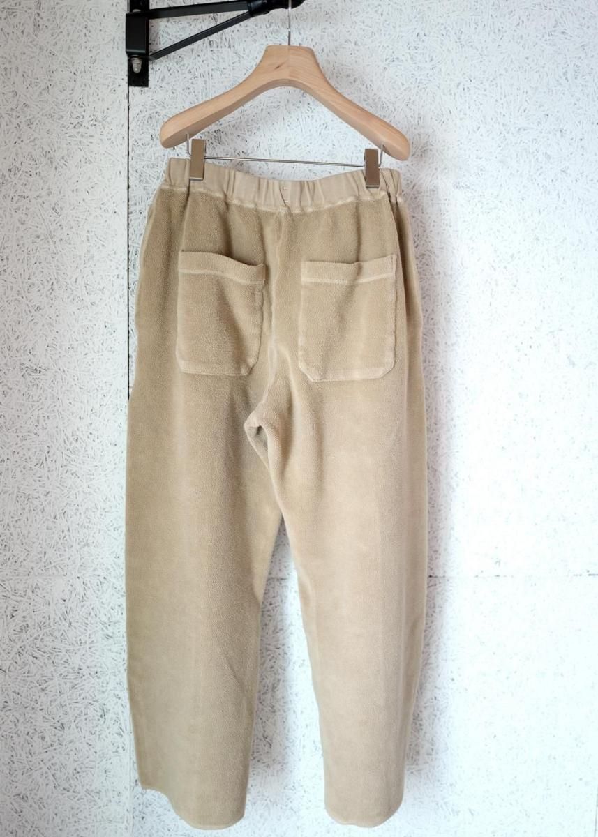 上質な綿糸が持つしなやかさと柔らかな風合いが特徴の裏毛を使用しています。 裏毛面を特殊な起毛機で細かく起毛させてそちらを表面として使用し、製品硫化染めしたあとにバイオウォッシュ加工をすることで独特なフェード感を表現しています。 肌にあたる裏面には起毛面より細番手のコットンを使用しているので、肌当たりはより柔らかく繊細なタッチになることも計算しています。 ※デッドストックの裏毛素材を使用してさらに特殊加工しているので、一点一点サイズ感が微妙に異なります。商品の特性としてご了承ください。 脇線を排することで脇に丸みを持たせたワイドシルエットが特徴のイージーパンツ。 ベルト裏のスピンドルでぎゅっと絞ることが出来るので、大きめのサイズを選んでオーバーサイズに着用するのもおすすめです。 セットアップでの着用もおすすめのシリーズです。