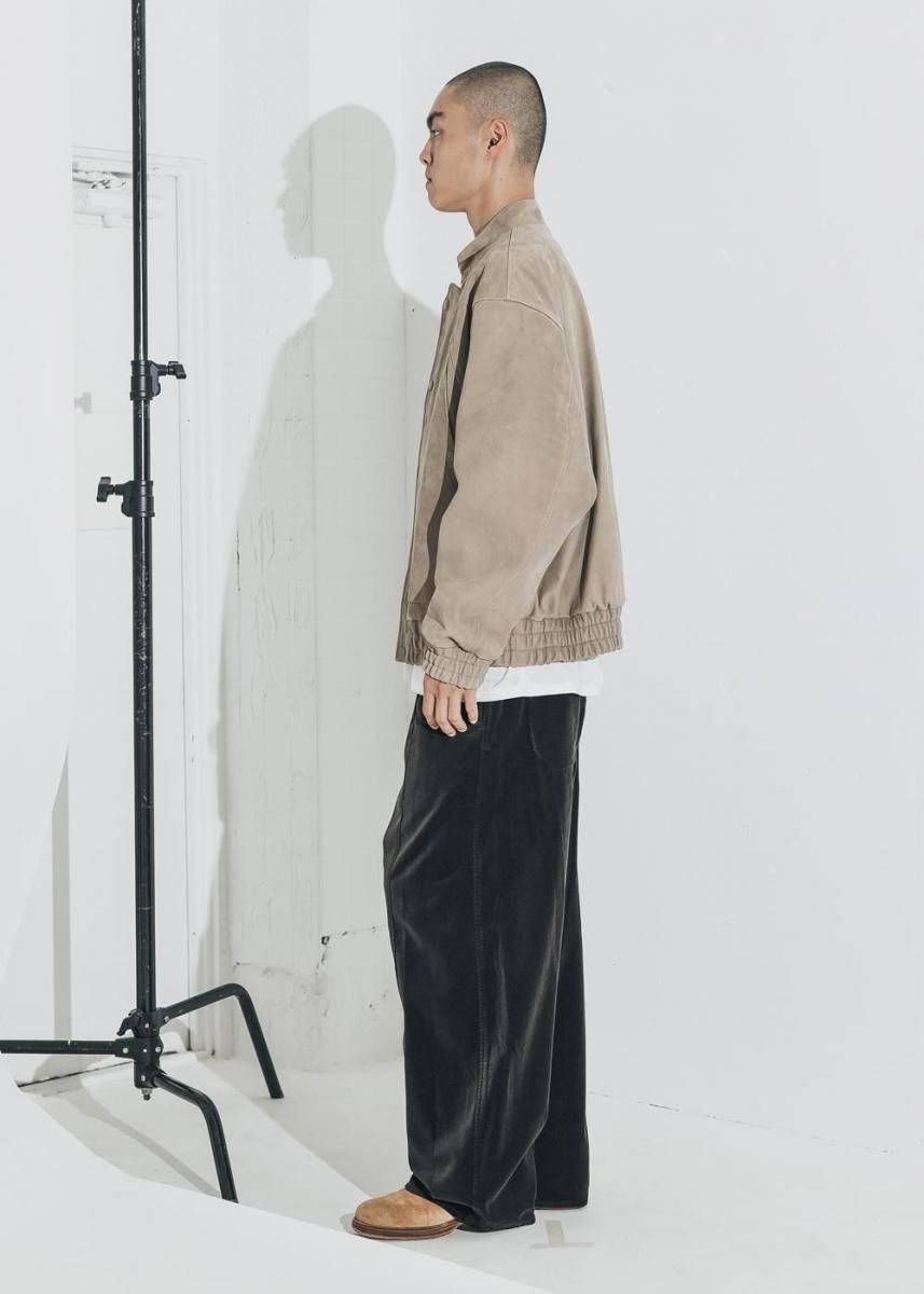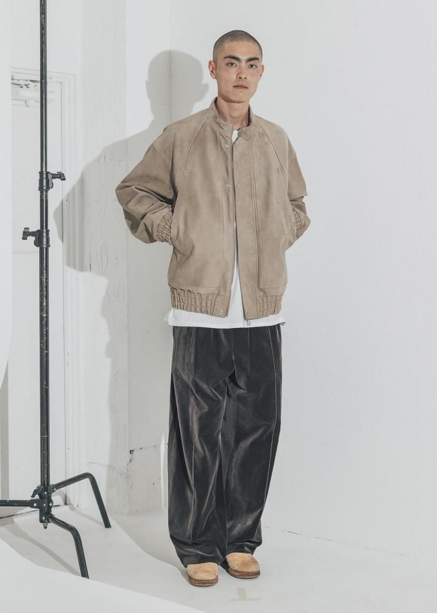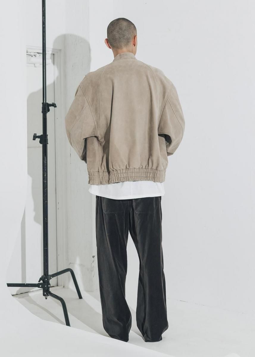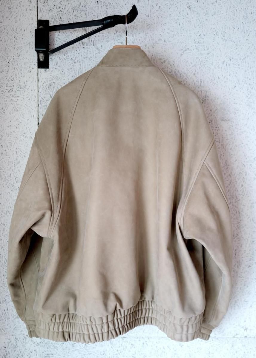 本来は鞄や靴に使用される革をあえて洋服に仕立てることに挑戦したシリーズです。表面の滑らかでシルキーなタッチと特有のハリ感を併せ持つカウヌバックを使用しています。 仕上げに裏面にナッパラン加工を施すことでよりハリ感を強く表現しています。 独特な丸みのあるフォルムバランスが特徴のブルゾン。上下2つに分かれたポケットは機能性抜群です。 裾と袖口にゴムを配し、裏地を付けているので真冬まで長く着用出来ます。